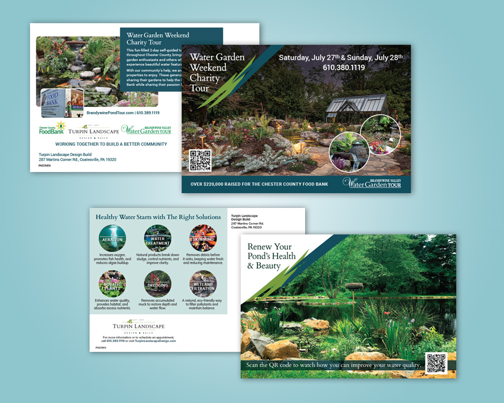 Projects include a marketing folder with stepped inserts, business cards, flyers, and direct mail. My role included layout, photo-retouching, illustration, and preparing final files.